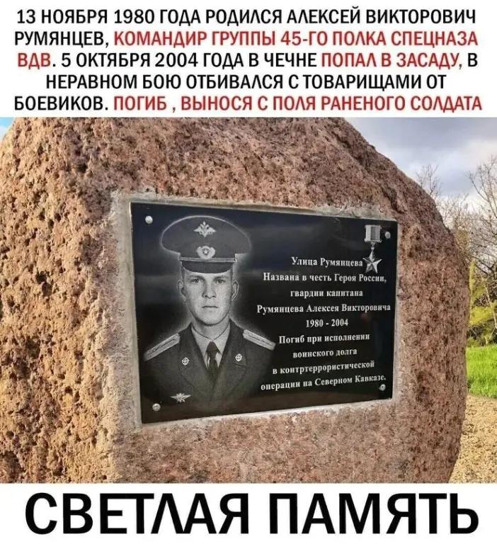 Румянцев Алексей Викторович- командир 2-й группы 2-й роты специального назначения 45-го отдельного гвардейского ордена Александра Невского разведывательного полка Воздушно-десантных войск, гвардии капитан.