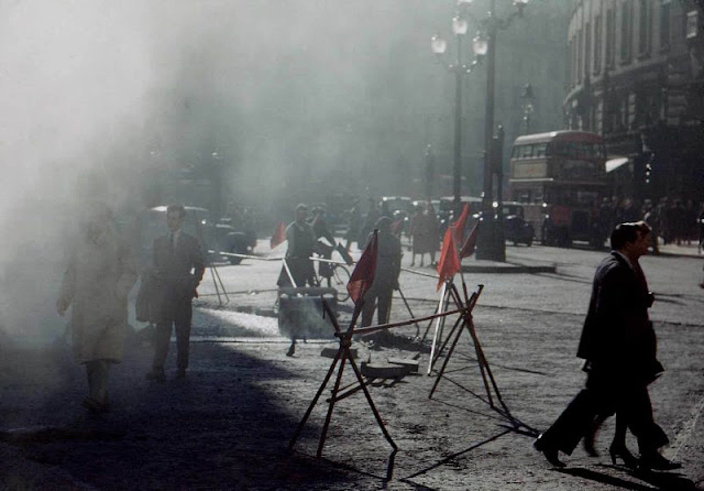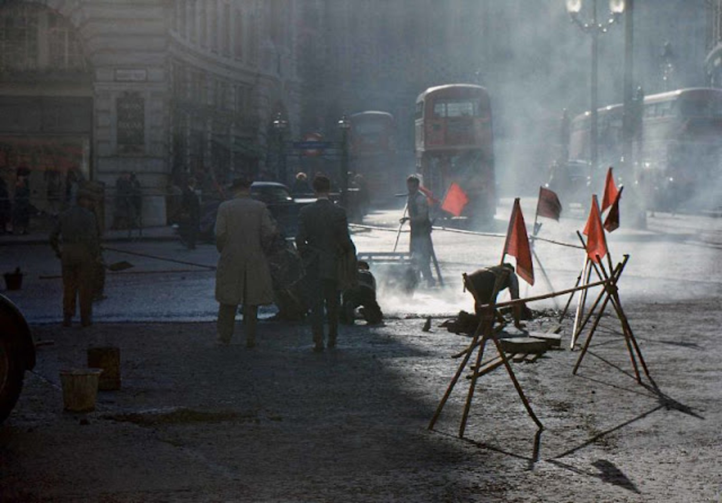 Атмосферу Лондона 1950-х определяли ритмичный шум красных даблдекеров RT-типа и вид джентльменов в котелках, совпавших с появлением субкультуры “Teddy Boy” в Южном Лондоне. [RT-type buses — это двухэтажные автобусы, которые стали знаковыми для Лондона в середине XX века. Они были разработаны совместно компанией Associated Equipment Company (AEC) и London Transport и стали символом города в 1950–1960-х годах. RT-тип — прямой предшественник автобуса Routemaster. Тедди-бои (Teddy Boys) — молодёжная субкультура, возникшая в Великобритании в начале 1950-х годов и несколько раз переживавшая возрождение в 1970-е и 1990-е годы. (Мне на память пришёл замечательный фильм «Заводной апельсин» Стэнли Кубрика)].