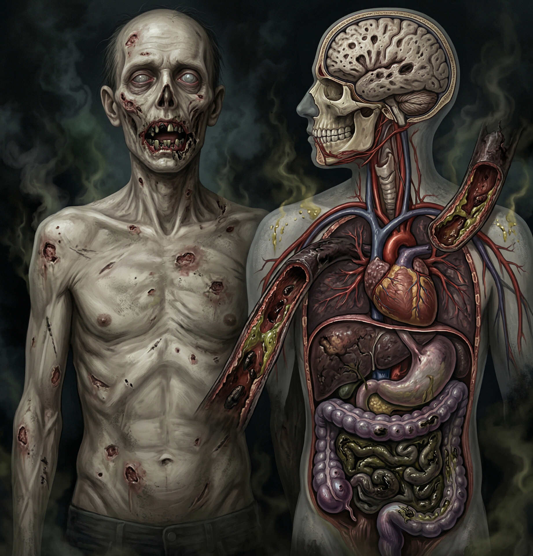 Живой некроз: Обычные бактерии, которые мирно жили у тебя во рту или на коже, внезапно понимают: этот парень больше не сопротивляется. Они начинают воспринимать тебя как шведский стол. Десны чернеют, зубы крошатся, а мелкие раны превращаются в гниющие дыры. Это не инфекция — это твоя собственная микрофлора начала процесс утилизации твоего тела, решив, что раз кровь не течет и защиты нет, значит, ты уже официально мертв.