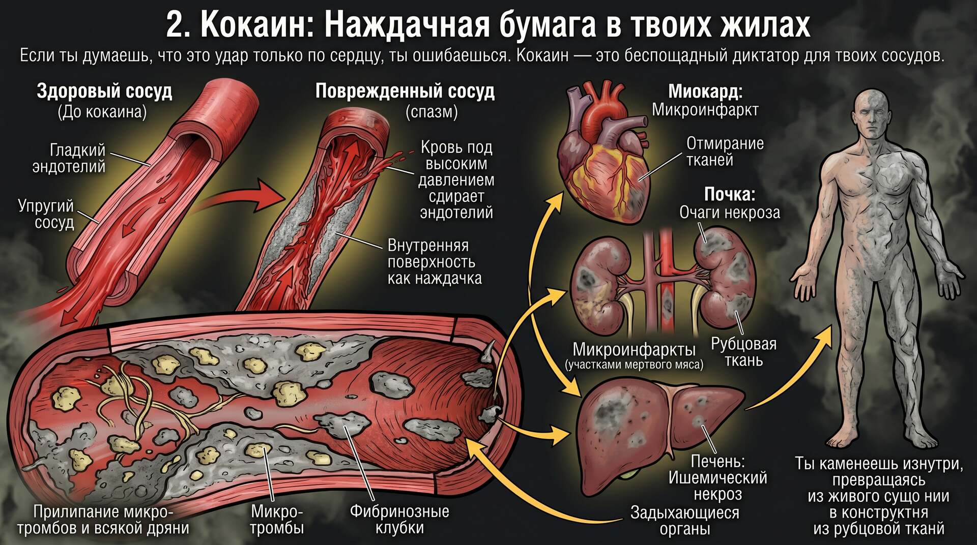 Результат: Внутренняя поверхность вен и артерий становится шершавой и липкой, как наждачка. К ней тут же прилипает всякая дрянь из крови, образуя микро-тромбы. Твои органы начинают задыхаться. Почки, печень и сердце покрываются микроскопическими участками мертвого мяса — микроинфарктами. Ты медленно каменеешь изнутри, превращаясь из живого существа в конструктор из рубцовой ткани.