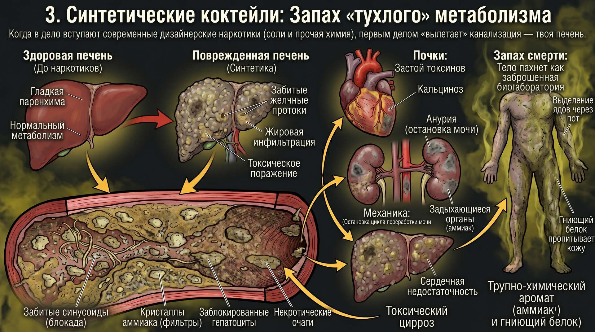 Запах смерти: Куда деваться ядам? Организм пытается вытолкнуть их через пот. Именно так рождается тот самый трупно-химический аромат, исходящий от потребителей. Это не плохая гигиена — это запах аммиака и гниющего белка, который пропитывает твою кожу изнутри. Тело буквально начинает пахнуть как заброшенная биолаборатория, потому что твои внутренние очистные сооружения больше не работают.