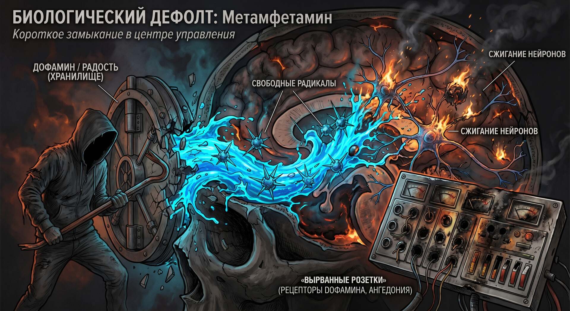 Этот парень действует как хакер-самоубийца. В норме твой мозг выдает дофамин («валюту радости») по чуть-чуть за реальные достижения. Метамфетамин выламывает двери хранилища ломом.