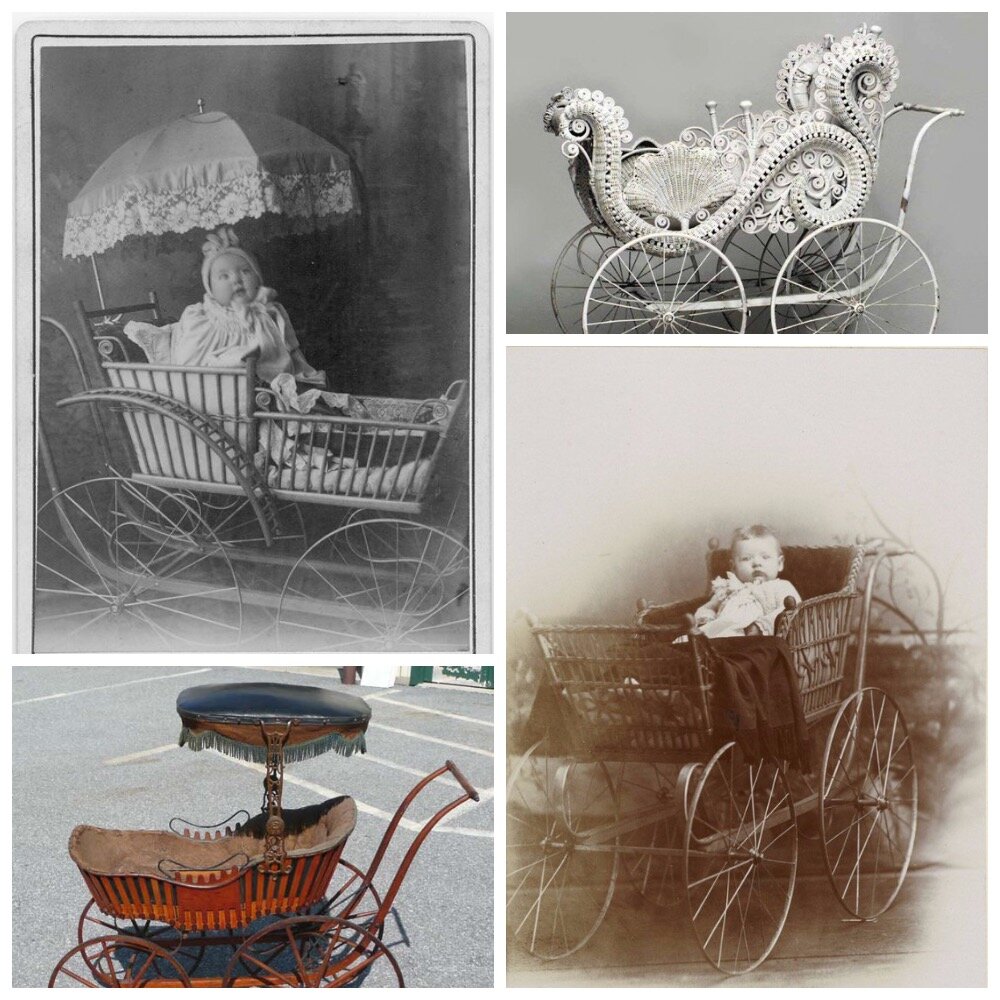 Альтернативным вариантом "магазинным" коляскам были плетеные, которые могли быть как на колесиках, так и на полозьях, наподобие санок. Такие коляски "ручного изготовления" сохранялись довольно долго.