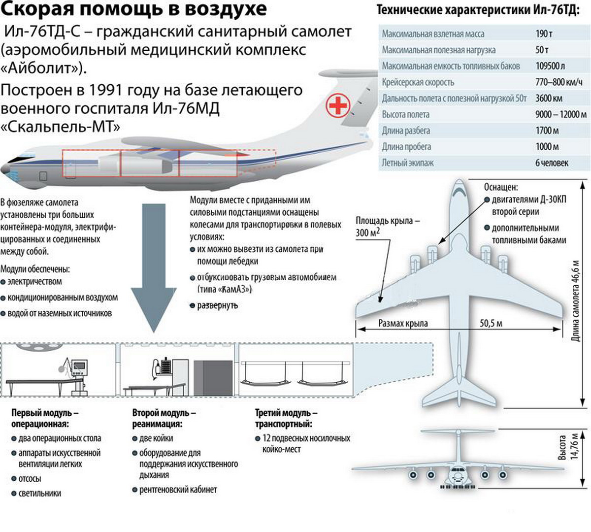 В фюзеляже самолета установлены три больших контейнера-модуля, электрифицированных и соединенных между собой. В первом из них размещены два операционных стола, аппараты искусственной вентиляции легких, отсосы, светильники – все приспособления, необходимые для проведения хирургической операции. Во втором – реанимационном отсеке расположены две койки, оборудование для поддержания искусственного дыхания, рентгеновский кабинет. Третий модуль спланирован как чисто транспортный, рассчитанный на 12 подвесных носилочных койко-мест.