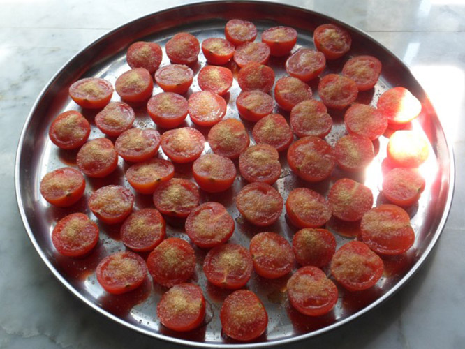 Свидетельствовать о готовности будет тот факт, что края помидор сморщатся и помидоры станут похожи на немного сморщенные шляпки шампиньонов. Перец же будет готов несколько ранее помидор.