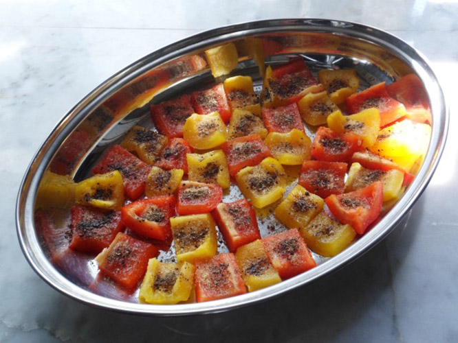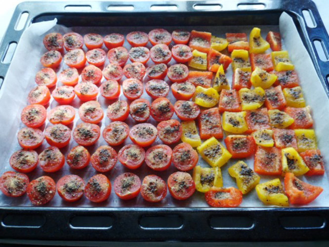 Сверху на каждую половину помидора и квадрат перца капнуть 2-3 капли растительного масла. Сделать это лучше при помощи шприца.