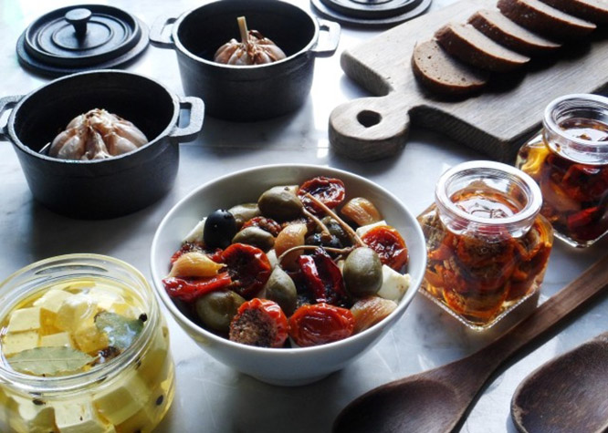 Смешать в произвольном количестве (по собственному усмотрению) вяленые помидоры и перец, маринованный сыр, зубцы запеченного чеснока, каперсы , оливки.