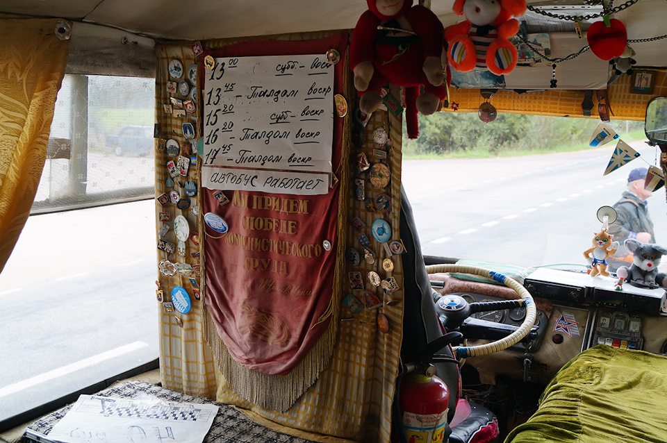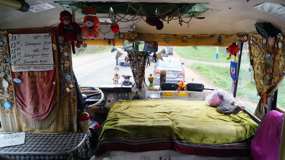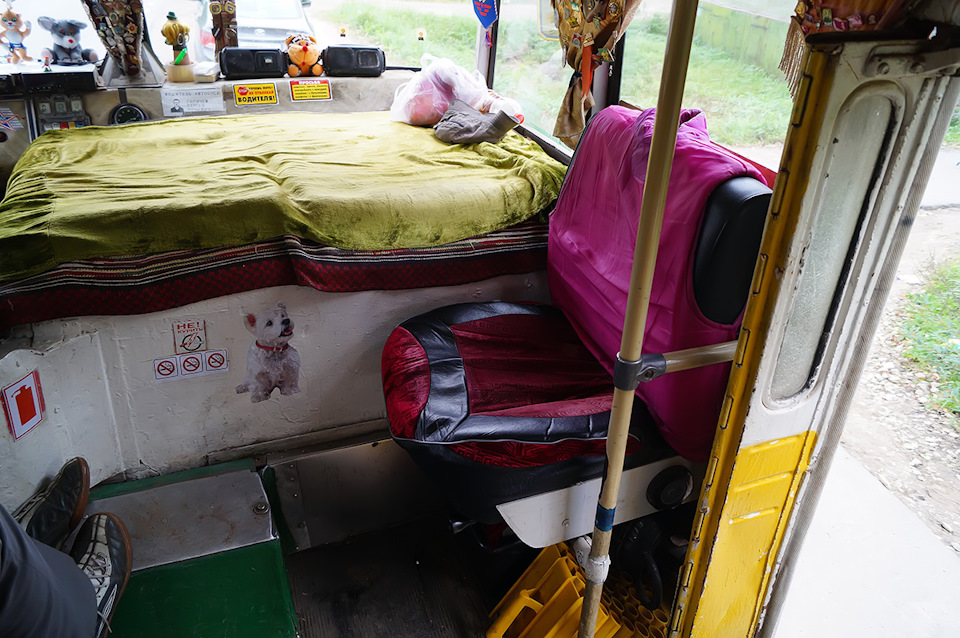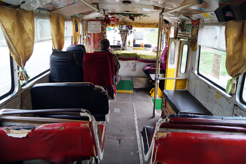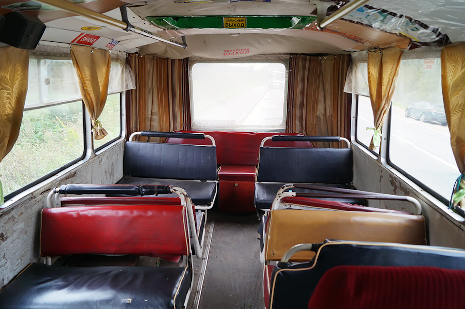 В салоне — диванчики с ПАЗиков-доноров. Родные лавки пошли в расход из-за ветхости, но место сзади — оригинальное.