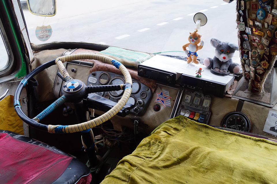В распоряжении водителя — скромная приборка от 53го ГАЗа, да мягкие игрушки