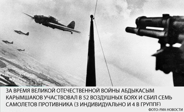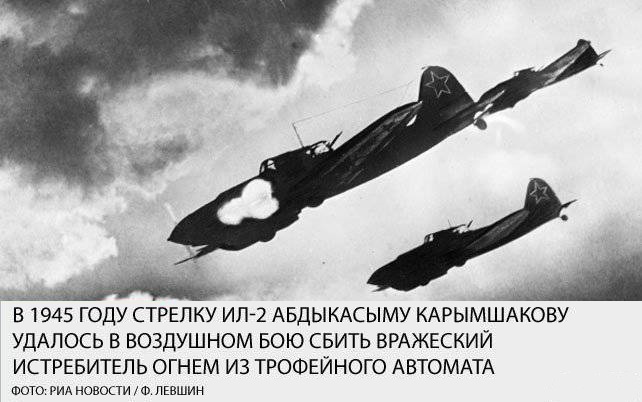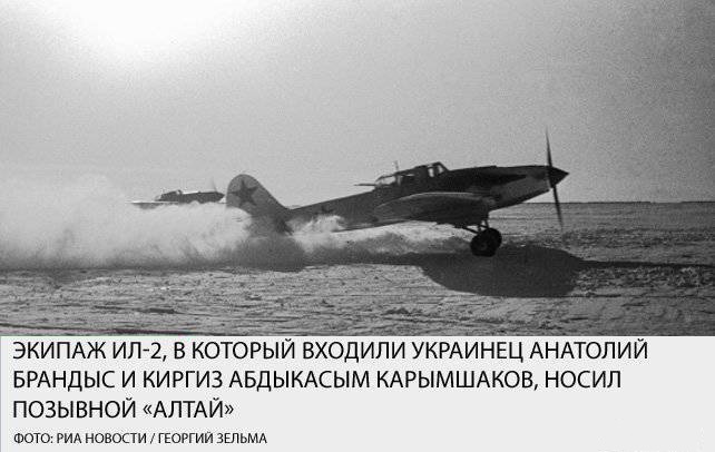 В годы войны эта незатейливая песенка была очень популярной. Штурмовик Ил-2 выпускался в одноместном и двухместном вариантах. Опыт боёв показал — Ил-2 является отличной машиной, но незащищённый сзади, слишком уязвим для немецких истребителей. Машину срочно стали выпускать в двухместном варианте, с кабиной для стрелка. Началась подготовка воздушных стрелков, которым предстояло занять места в экипажах «Илов». Выживаемость Ил-2 зависела во многом от мастерства стрелка. При этом его кабина из-за особенностей конструкции была защищена хуже, чем кабина пилота. И потери среди стрелков были куда большими, чем среди лётчиков. Обо всём этом Абдыкасым прекрасно знал, но это его не останавливало. С января 1943 года выпускник школы воздушных стрелков младший сержант Карымшаков проходил стажировку в запасном авиаполку, а в мае 1943-го был направлен в действующую армию. В 75-м гвардейском штурмовом авиаполку Абдыкасыма распределили в экипаж младшего лейтенанта Анатолия Брандыса, уроженца Днепропетровска. В конце сентября 1943 года у Ил-2 Брандыса и Карымшакова при возвращении с боевого задания забарахлил мотор. Штурмовик отстал от группы, и тут же его атаковал «мессер», решивший, что легко справится с «илом». Не тут-то было — стрелок трижды отражал атаки немецкого аса и позволил командиру уйти от преследования. Воздушный стрелок на фронте — профессия дефицитная. Когда выбывали по ранению товарищи, Абдыкасым вылетал и в составе других экипажей, совершая по три вылета в день. В полку его называли «снайпером», и в этом не было преувеличения. На его счету были уничтоженные вражеские машины, зенитки. В ноябре 1943 года Абдыкасым Карымшаков официально записал на свой счёт первый сбитый вражеский самолёт, уничтожив немецкий Ме-109. Анатолия и Абдыкасыма неоднократно сбивали — для штурмовика это скорее норма, чем событие чрезвычайное. Но выбраться из пекла — задача крайне непростая.