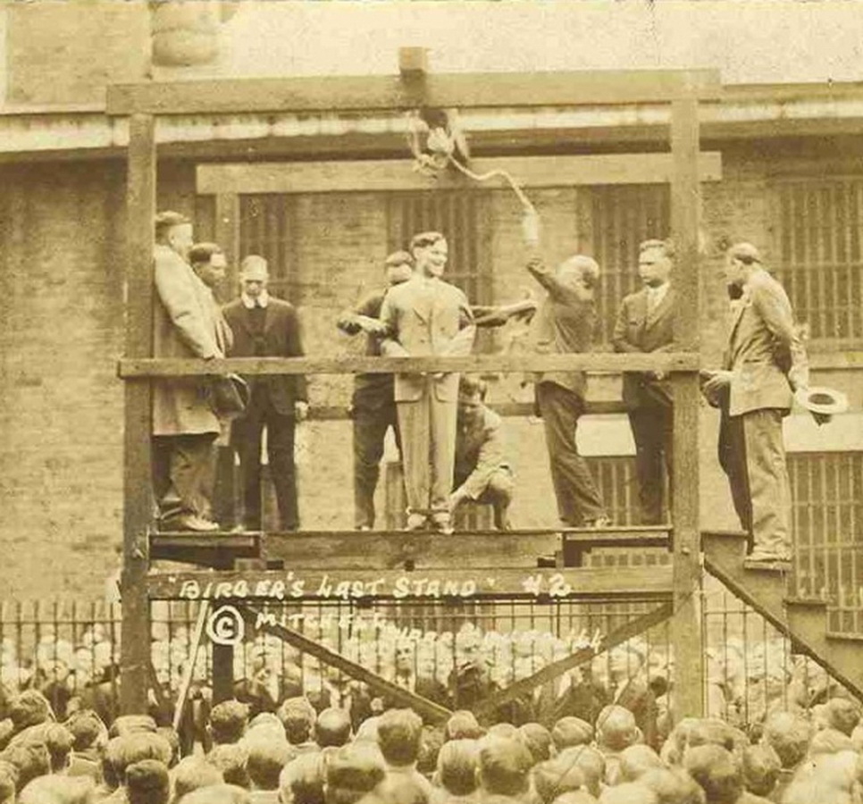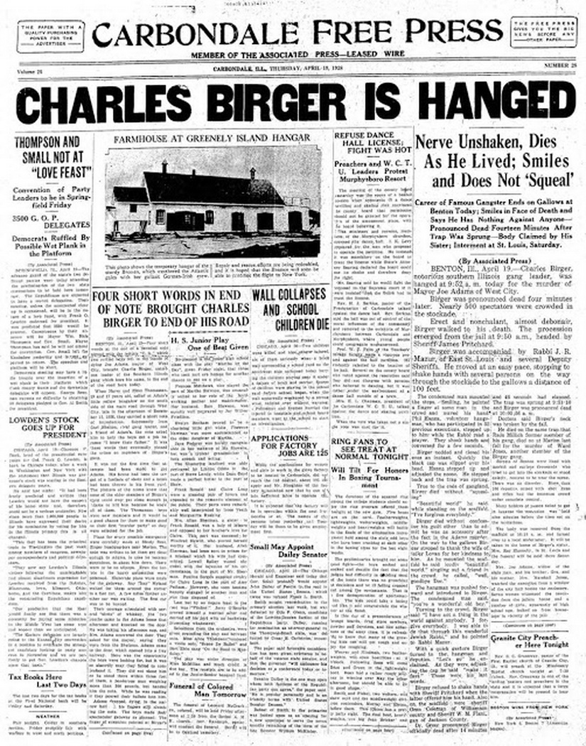 19 апреля 1928 года в Бентоне повесили Чарли Биргера. Это был отъявленный бутлегер и главарь банды, наживавшийся на азартных играх и подпольной торговле алкоголем. В бытность свою в Иллинойсе он вёл непримиримую войну с Ку-Клукс-Кланом, выступавшим за соблюдение сухого закона, и с конкурирующей бандой братьев Шелтонов, выплеснув насилие на улицы округов Уильямсон и Франклин. (у меня есть несколько публикаций про сухой закон в США, вот одна из них: 1359554).