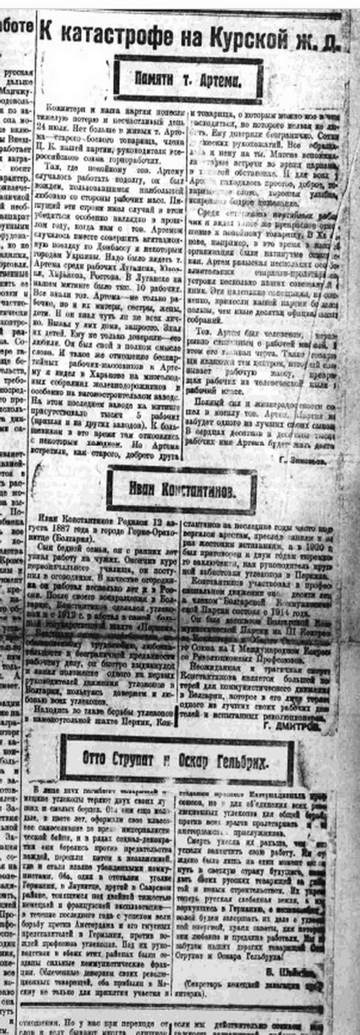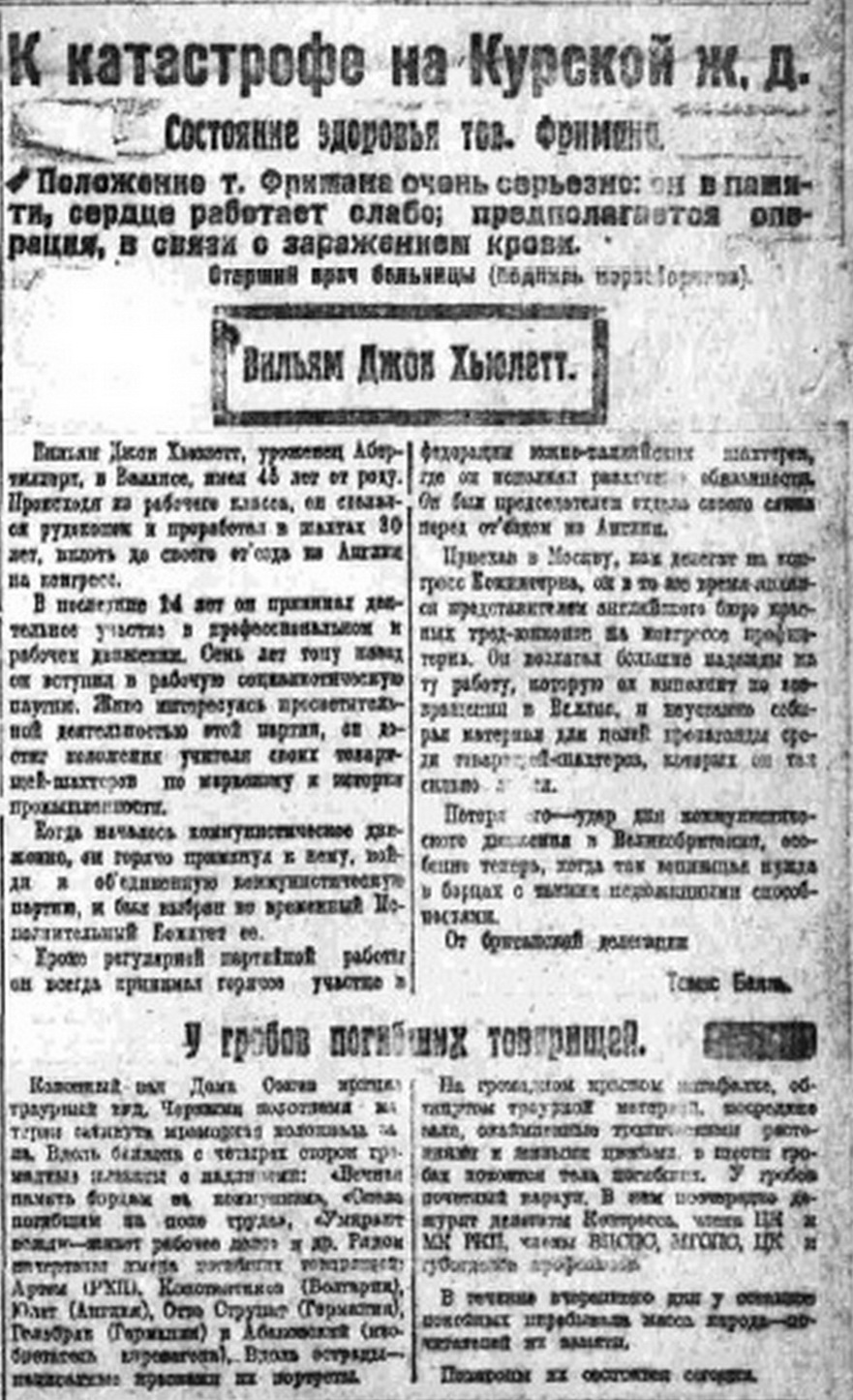 Чтобы противостоять влиянию Троцкого, Артём по указаниям Ленина создал международный союз горнорабочих. Его правящий комитет был создан за несколько дней до трагедии. А Троцкий к тому времени сосредоточил в руках большую власть: большинство в армии было за него, так же, как и мелкая буржуазия».
