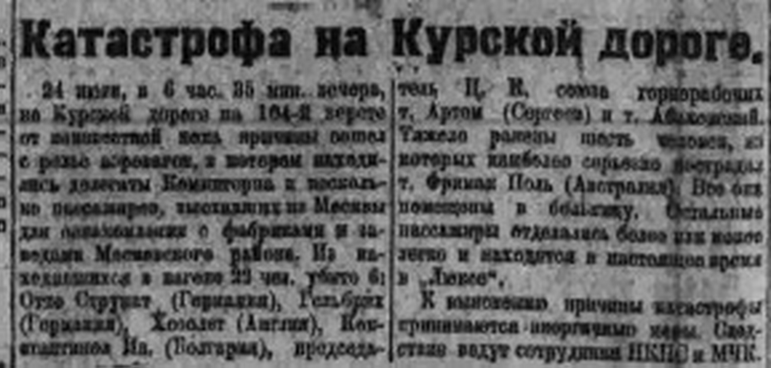 Посетив торжественное заседание Тульского горсовета в местном театре, делегация поспешила назад; теперь поезд мчался со скоростью 80-85 км/ч. В 18.35 под Серпуховом, в 111 километрах от Москвы, аэровагон на полном ходу сошёл с рельсов и «разлетелся на куски». Через два дня газета «Правда» напечатала заметку под заголовком: «Катастрофа на Курской дороге». В ней, в частности, было написано: «Из находившихся в вагоне 22 чел. Убито 6: Отто Струнат (Германия), Гельбрих (Германия), Хьюлетт (Англия), Константинов Ив. (Болгария), председатель ЦК союза горнорабочих т. Артём (Сергеев) и т. Абаковский». Седьмой человек (Пол Фриман) позже скончался от травм.