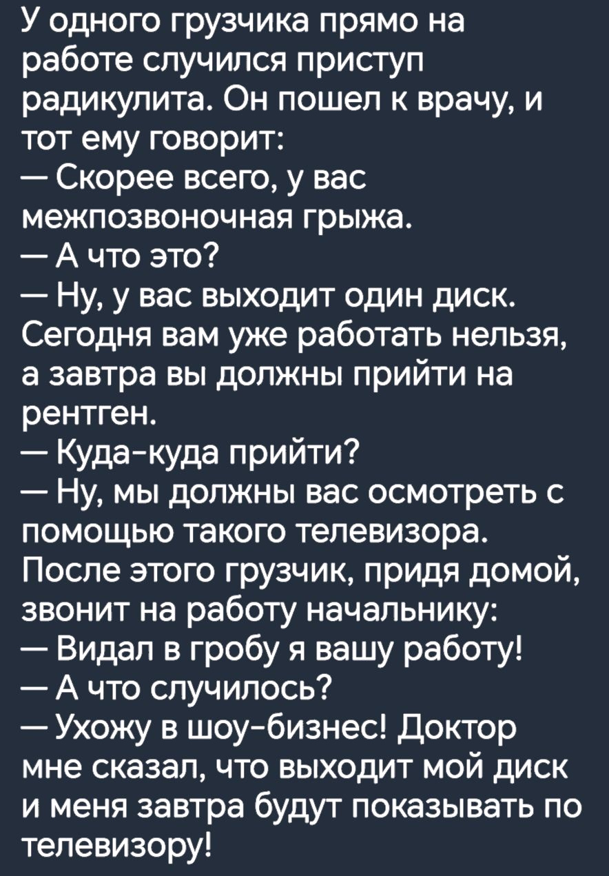 | pokazuha.ru НЕ является открытым ресурсом. Копирование материалов запрещено. Разрешены ссылки на публикации. Ссылка: http://pokazuha.ru/view/topic.cfm?key_or=1538070 HTML: <a href="http://pokazuha.ru/view/topic.cfm?key_or=1538070">Вечерние анекдоты! 198 </a> ВВcode: [URL=http://pokazuha.ru/view/topic.cfm?key_or=1538070]Вечерние анекдоты! 198 [/URL] |