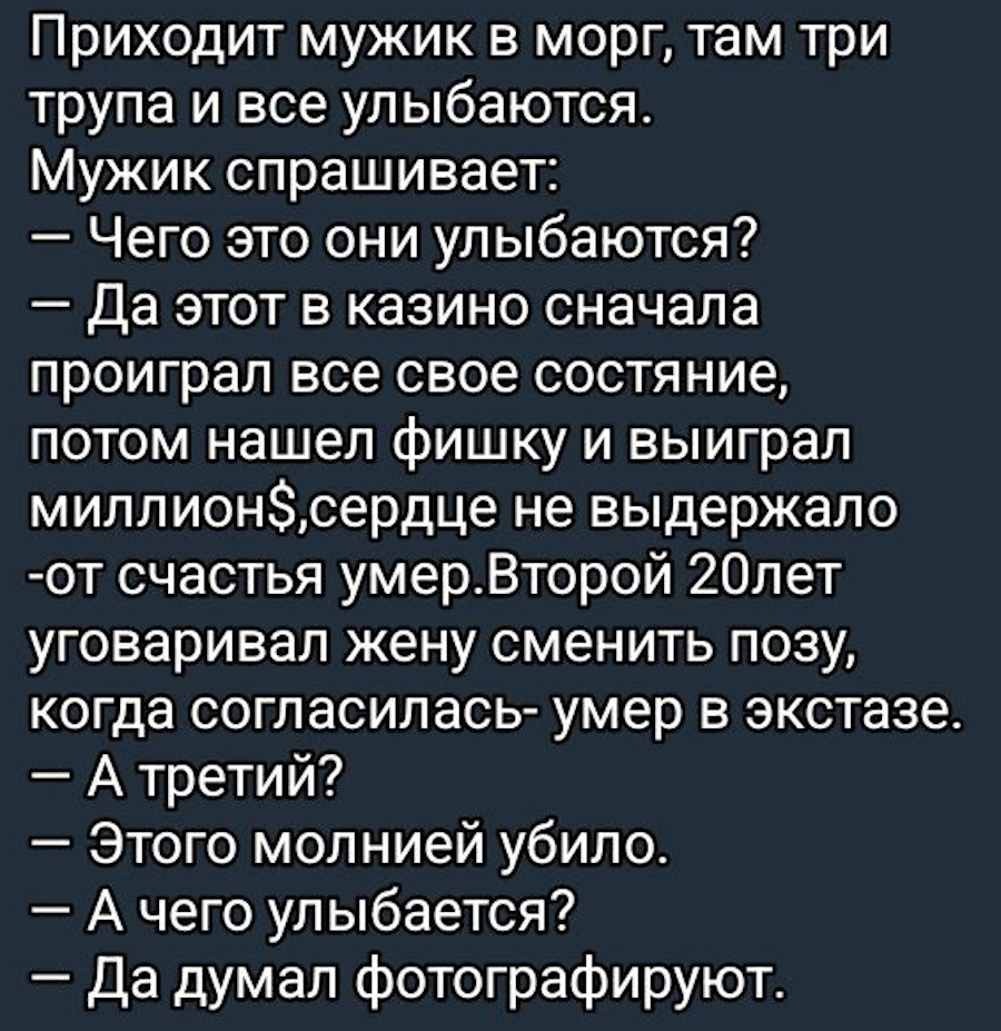 pokazuha.ru НЕ является открытым ресурсом. Копирование материалов запрещено. Разрешены ссылки на публикации. Ссылка: http://pokazuha.ru/view/topic.cfm?key_or=1560595 HTML: <a href="http://pokazuha.ru/view/topic.cfm?key_or=1560595">Вечерние анекдоты! 253 </a> ВВcode: [URL=http://pokazuha.ru/view/topic.cfm?key_or=1560595]Вечерние анекдоты! 253 [/URL] |