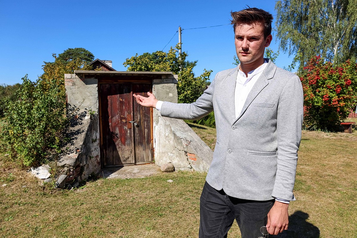 Мы находимся на главной улице Домачево вместе с учителем истории местной школы Кириллом Гавриленко. Он указывает на жилой дом и погреб — вот все, что осталось от зданий детского дома, которые сейчас используются для других нужд. Рядом расположена церковь.