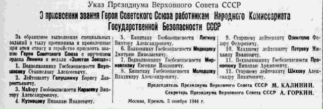 5 ноября 1944 года Дмитрию Николаевичу Медведеву было присвоено звание Героя Советского Союза. В указе он стоит под №6. А под №4 - Николай Иванович Кузнецов. Даже не указано его звание.