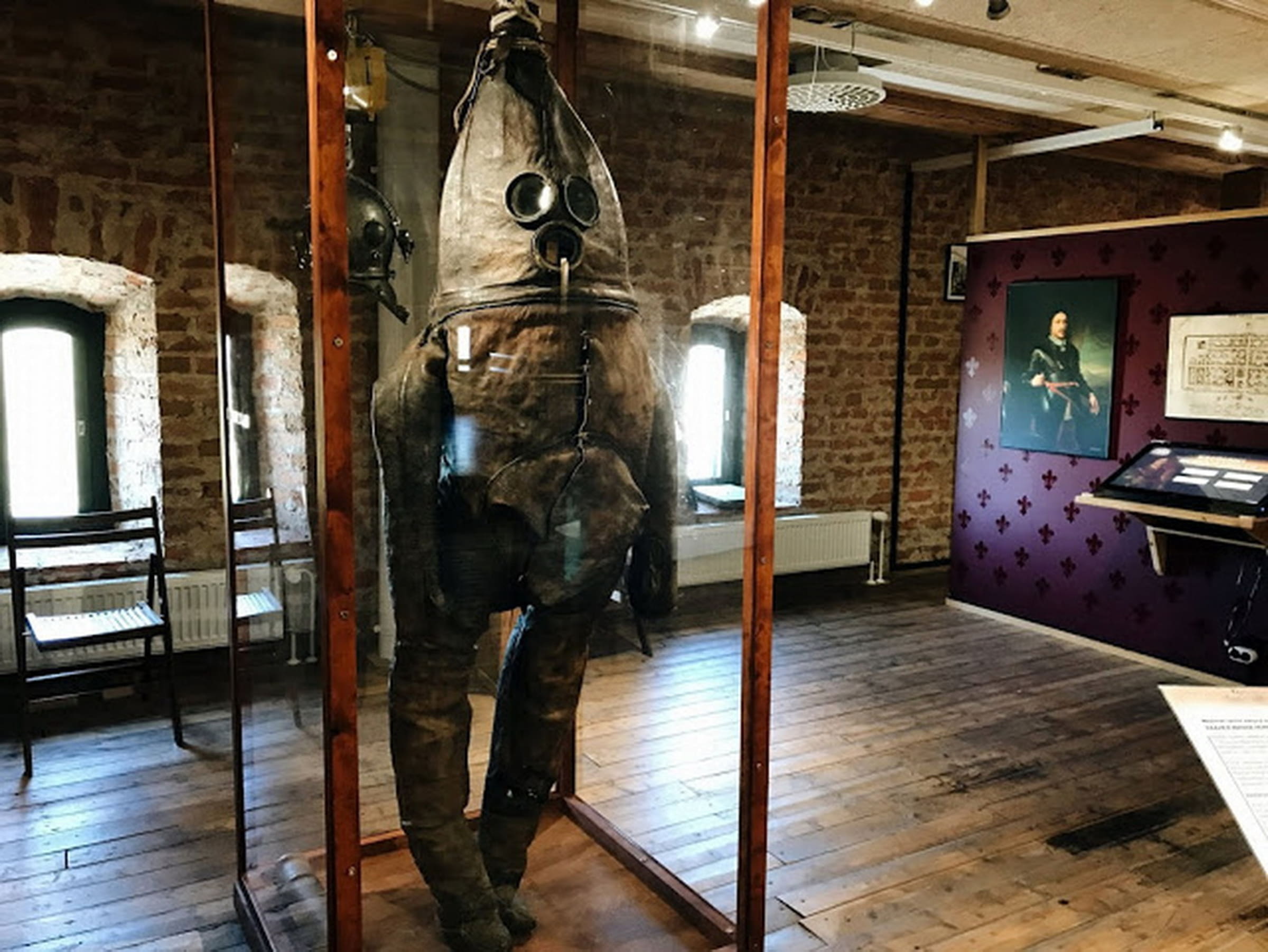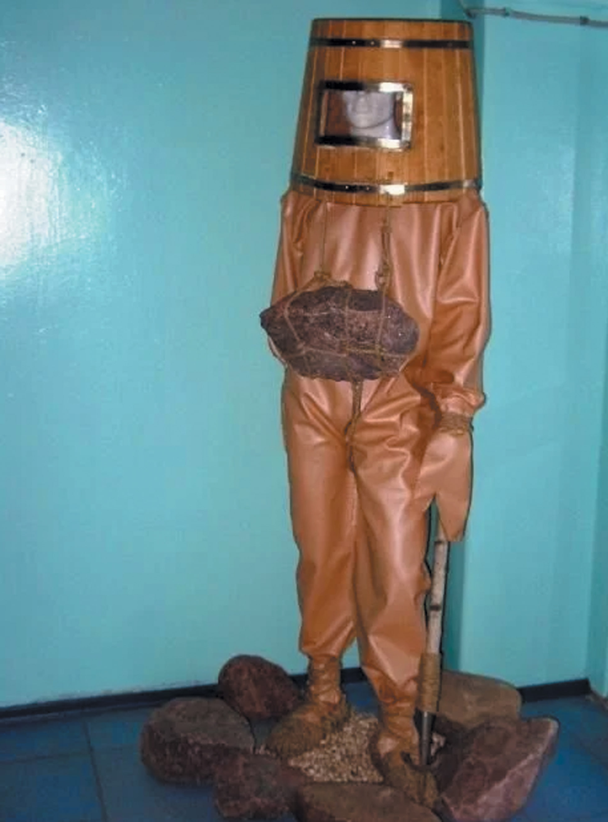 2. При виде этого костюма мне сразу вспомнился «Старый господин из Раахе», один из первых водолазных костюмов, сделанный предположительно в XVIII веке [моя публикация: №1432947]. Согласитесь, сходство весьма большое. Вспомним, для чего создавались первые подводные костюмы и суда: для войны и для торговли. Первая русская подводная лодка, «потаённое судно», макет которого стоит у нас в Сестрорецке, предназначалась именно для уничтожения вражеских кораблей.