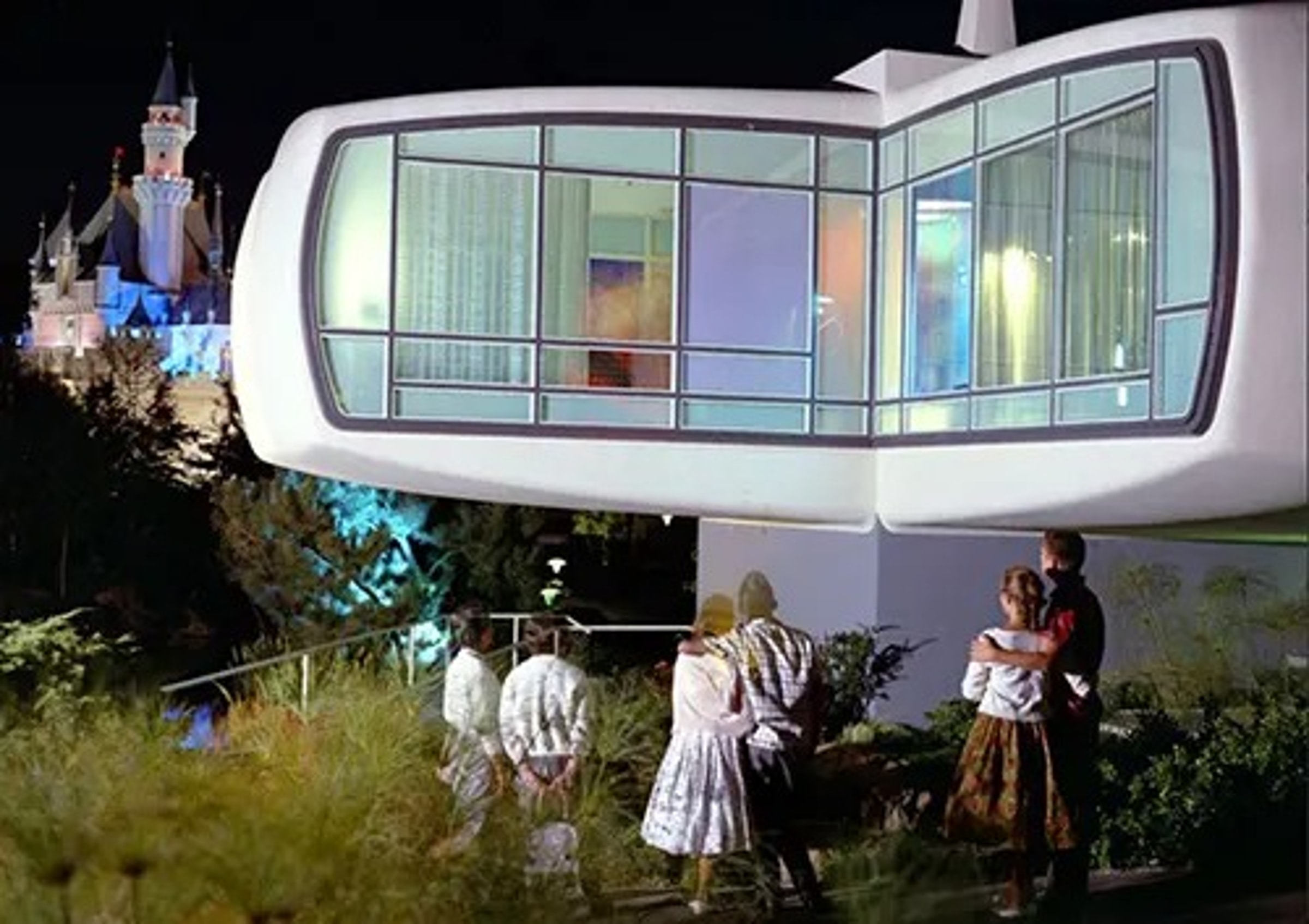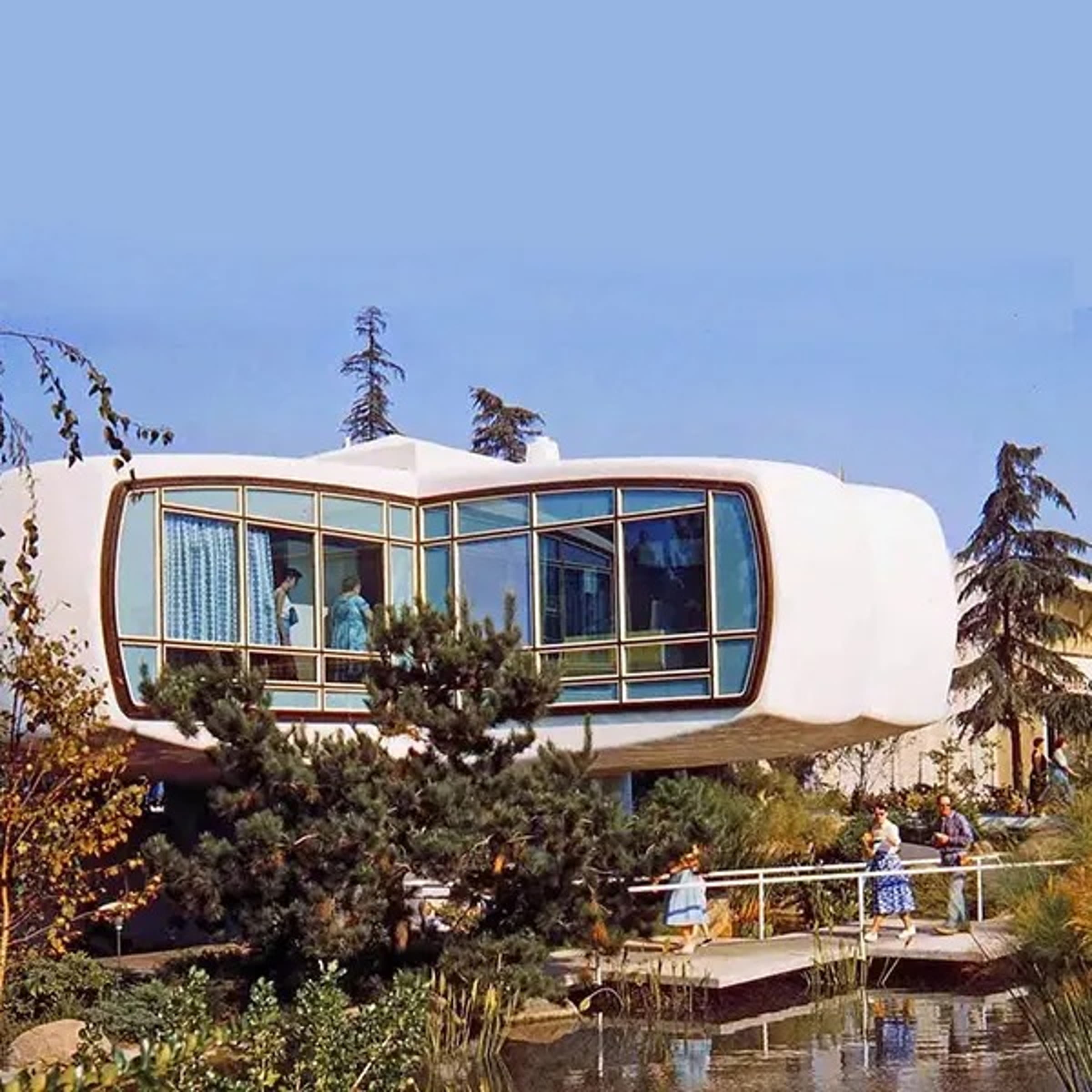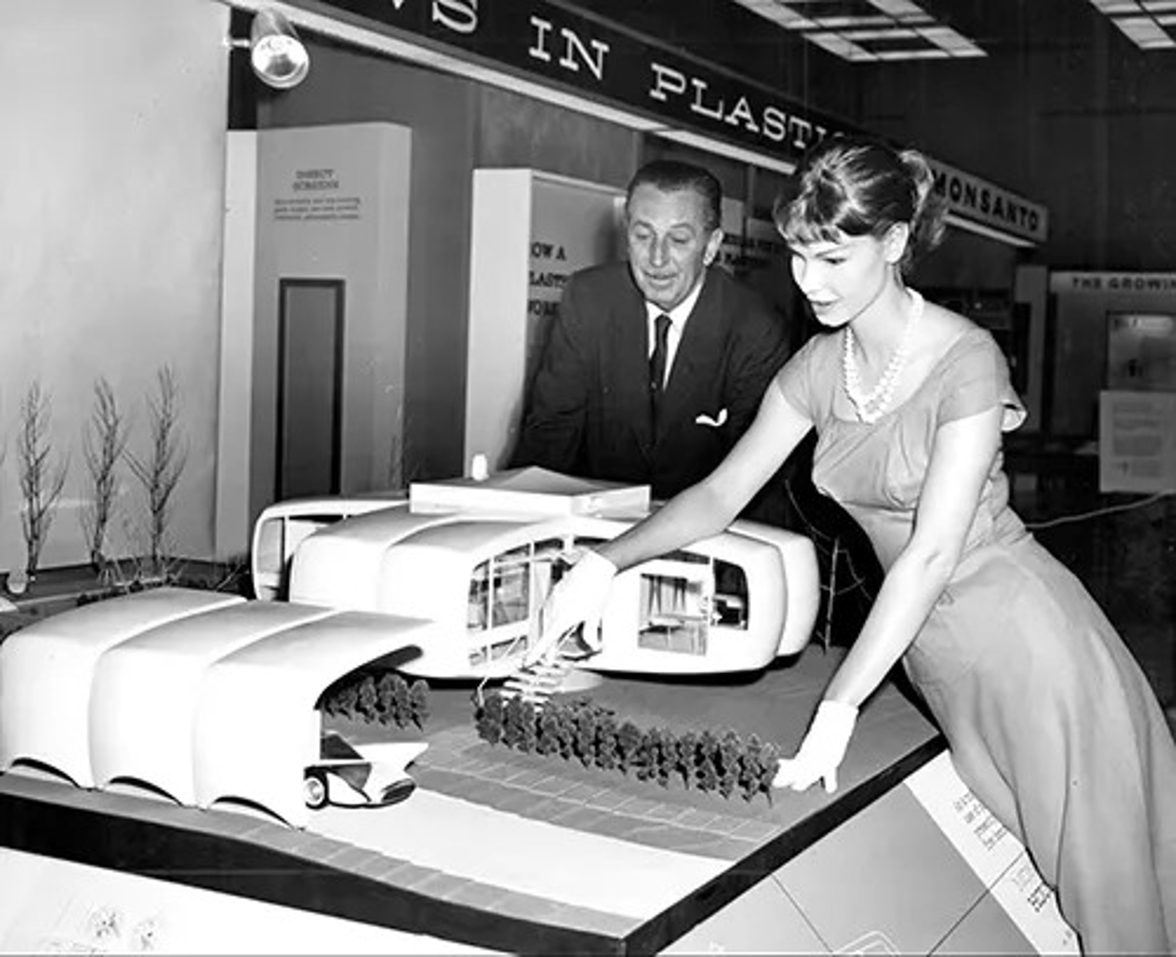 Появившийся в «Туморроуленде» (Tomorrowland) в 1957 году, Дом Будущего Монсанто (Monsanto’s House of the Future) являл собой оптимистичное представление того, как пластик и новшества в промышленности могут изменить американский дом. [Tomorrowland — тематическая зона в парке Disneyland, посвящённая будущему и космосу. Здесь находятся аттракционы, развлечения и рестораны, связанные с этой темой].