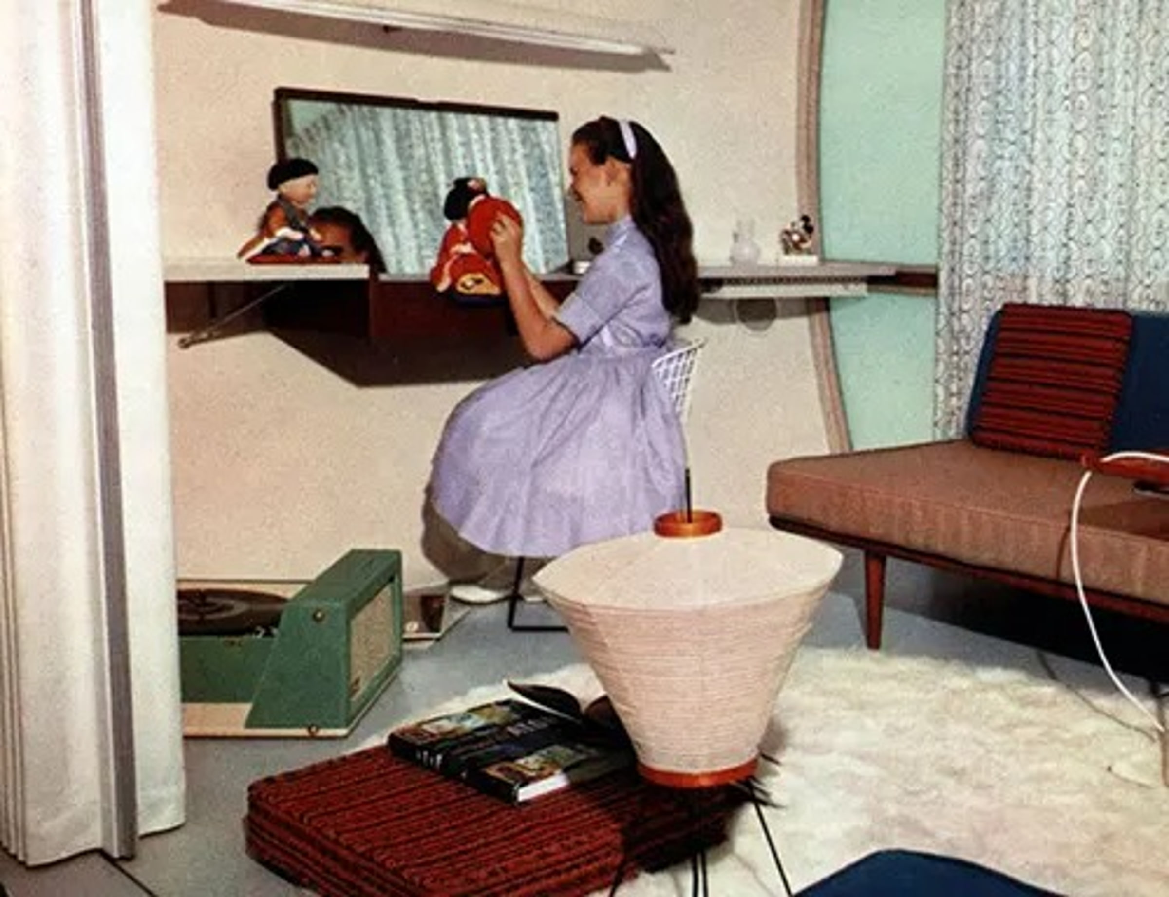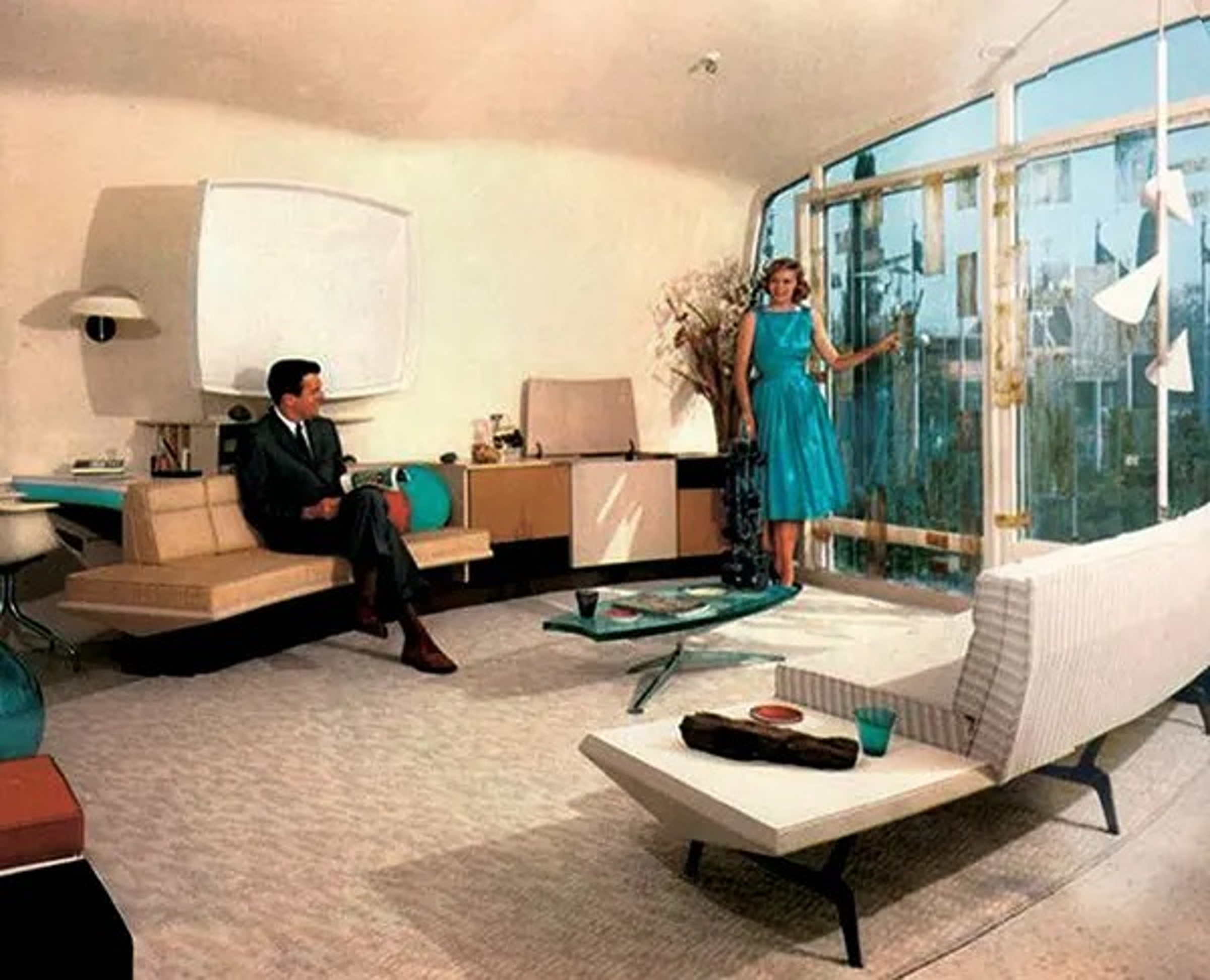 Повсюду применялись такие материалы, как акрилон, меламин, вискоза, винил для напольных покрытий и фанера, показывая, как пластик может работать вместе с традиционными строительными материалами или заменять их.