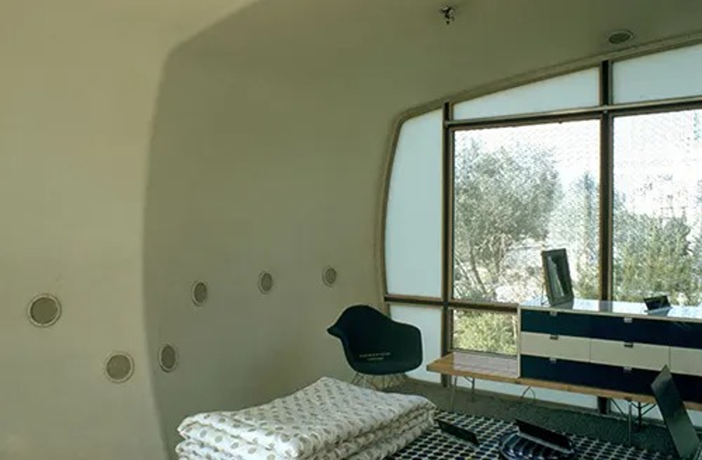 И встроенная мебель, и отдельно стоящие предметы следовали изогнутым линиям строения, усиливая впечатление, что комната была спроектирована с применением новинок дизайна, а не традиционных решений.