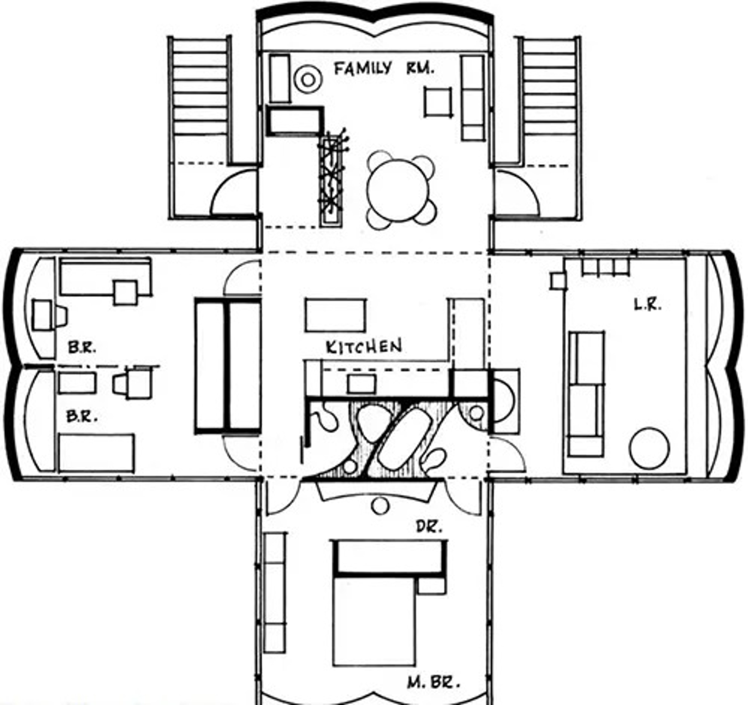 Внутренность дома представляла собой квадратный центр, вмещавший кухню и санузел, а четыре крыла, шедшие от него, образовывали главную спальню, детскую спальню, гостиную и столовую.