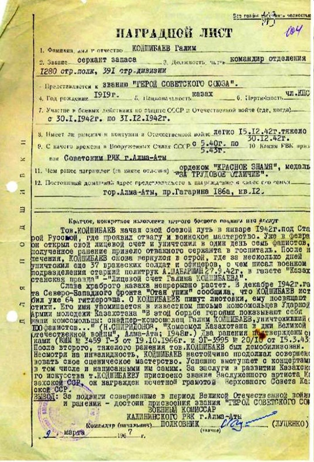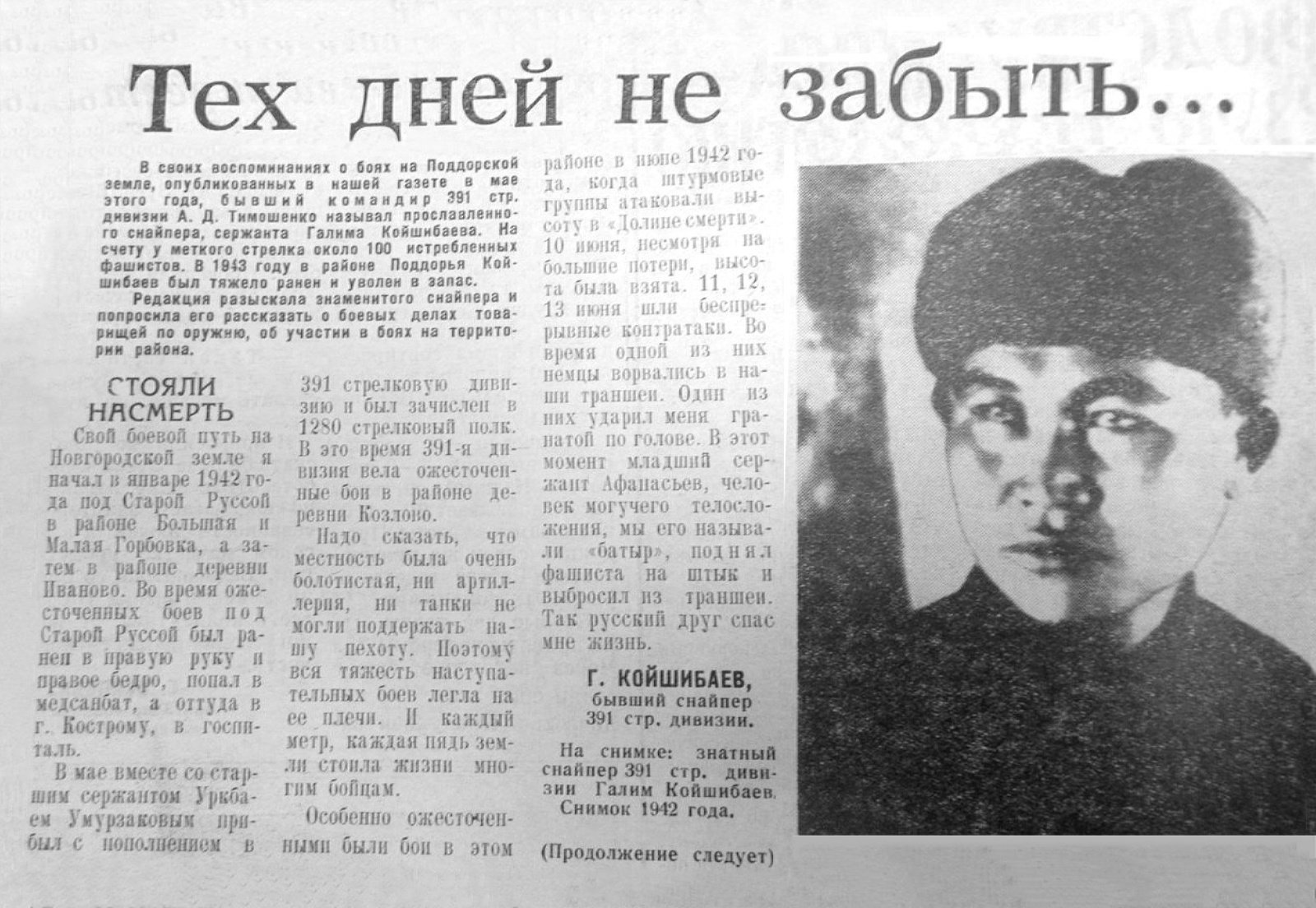 Красноармейская газета 391-й стрелковой дивизии "За Родину, за Сталина!" от 21 сентября 1942 года в статье "Следуйте примеру лучших снайперов" сообщает, что красноармеец Койшибаев уничтожил более 20 фашистов. Эта же газета всего через 4 дня (25 сентября) в статье "Мсти, воин!" приводит новую цифру - 37 убитых врагов, а через месяц - 64 фашиста...