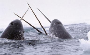 19. Нарвал (Narwhal) - единорог (лат. Monodon monoceros), млекопитающее семейства единороговых; единственный вид рода нарвалов. Длина тела взрослого нарвала 3,5—4,5 м, новорождённых около 1,5 м. Масса самцов достигает 1,5 т, из них примерно треть веса составляет жир; самки весят около 900 кг. Голова круглая, с нависающим лобным бугром; спинного плавника нет. Рот маленький, расположен снизу.